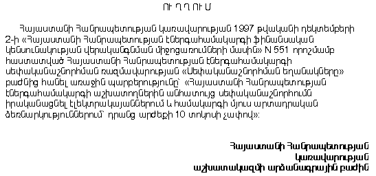 ՀԱՍՏԱՏՎԱԾ Է ՀՀ ԿԱՌԱՎԱՐՈՒԹՅԱՆ 1997 Թ. ԴԵԿՏԵՄԲԵՐԻ 2-Ի N 551 ՈՐՈՇՄԱՄԲ |