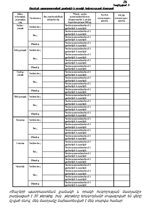 3. Հաստատել Հայաստանի Հանրապետության արդարադատության նախարարության քրեակատարողական հիմնարկներում պահվող դատապարտյալներին և կալանավորված անձանց տրվող սննդի հսկողության «Ճաշերի պատրաստման քանակի և որակի հսկողության մատյանի» ձևը, հավելված 3 (ձևը կցվում է):