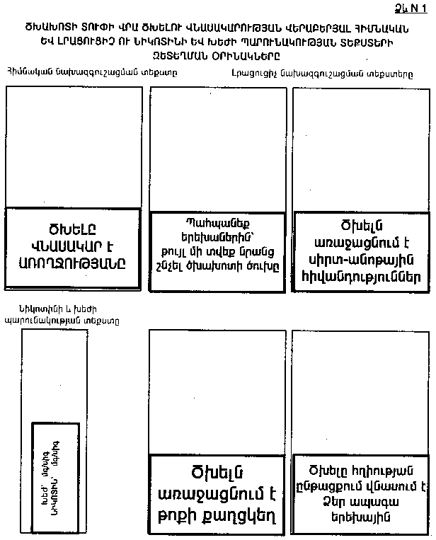 դ) նիկոտինի և խեժի պարունակության վերաբերյալ տեքստը պետք է տպված լինի դրա համար նախատեսված մակերևույթի կենտրոնում, տուփի կողմնային եզրին զուգահեռ և բացելիս հնարավոր լինի խուսափել այն վնասելուց.