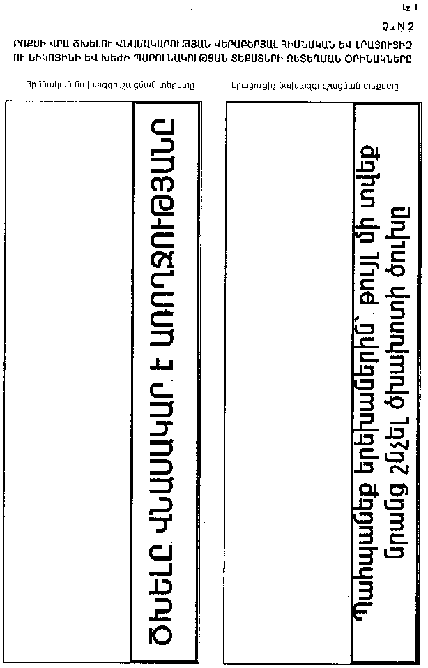 դ) նախազգուշացման տեքստերը պետք է գտնվեն դրանց համար նախատեսված մակերևույթի կենտրոնում, տուփի վերին եզրին զուգահեռ և բացելիս հնարավոր լինի խուսափել այն վնասելուց.